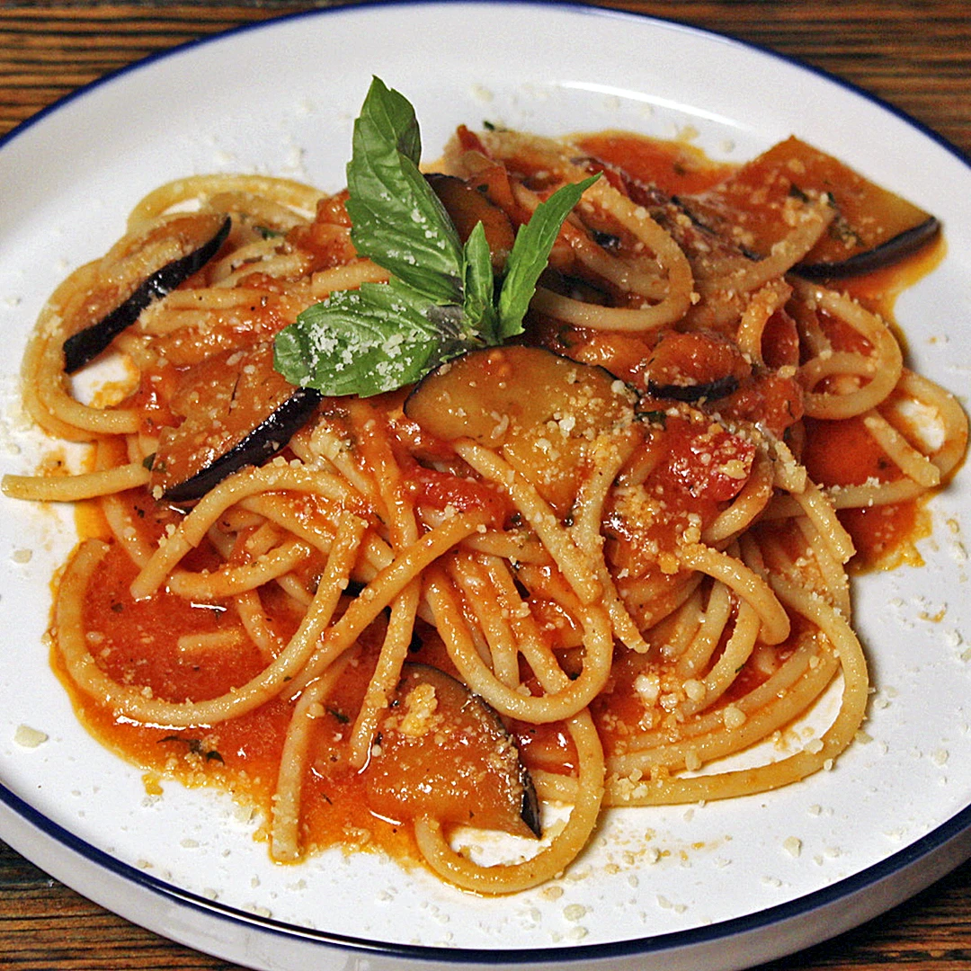 Bucatini Pasta Served in a Collina Tomato Sauce, Sliced Eggplant & Fresh Basil.