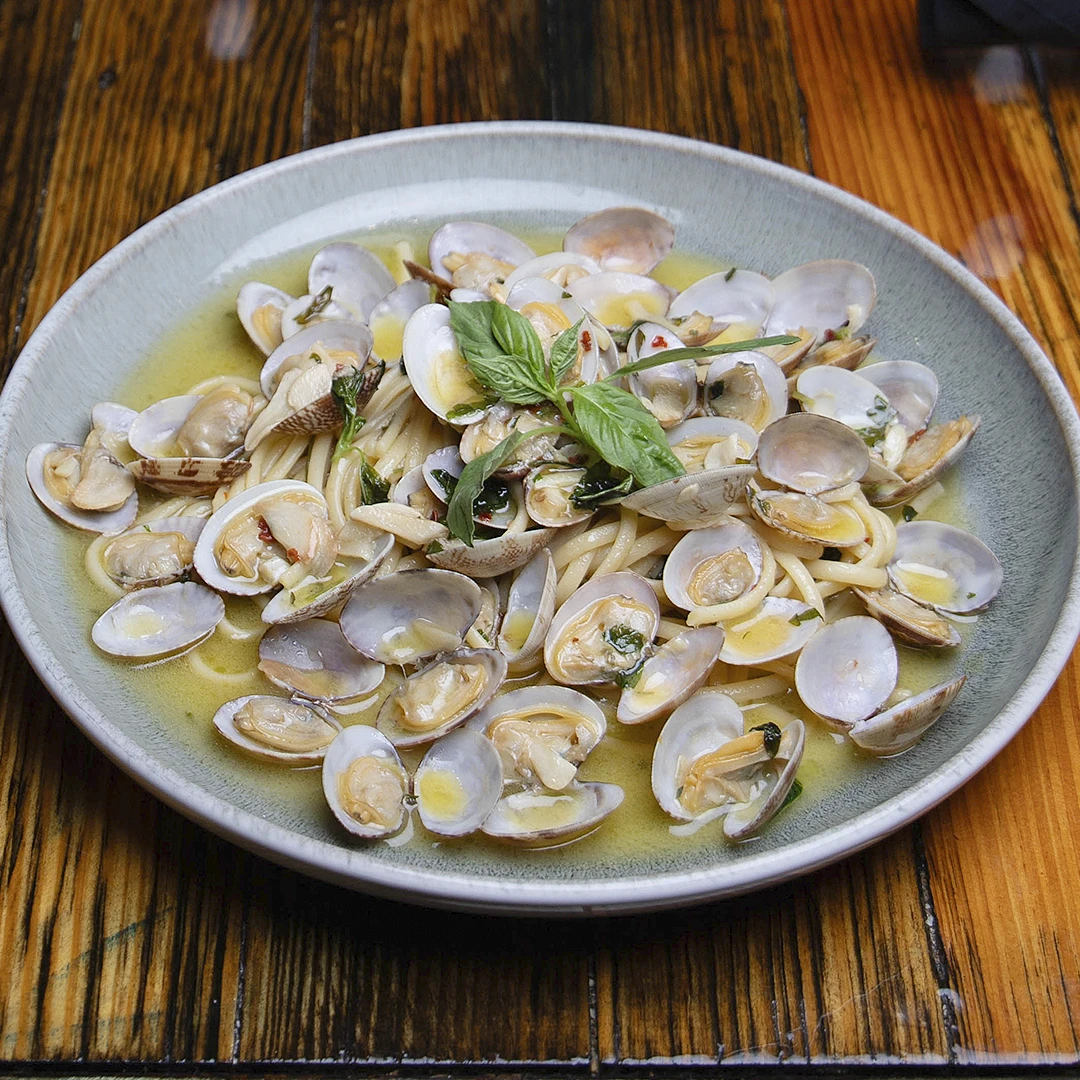 Linguine Pasta served in a White Wine Sauce, Baby Clams & Fresh Garlic.