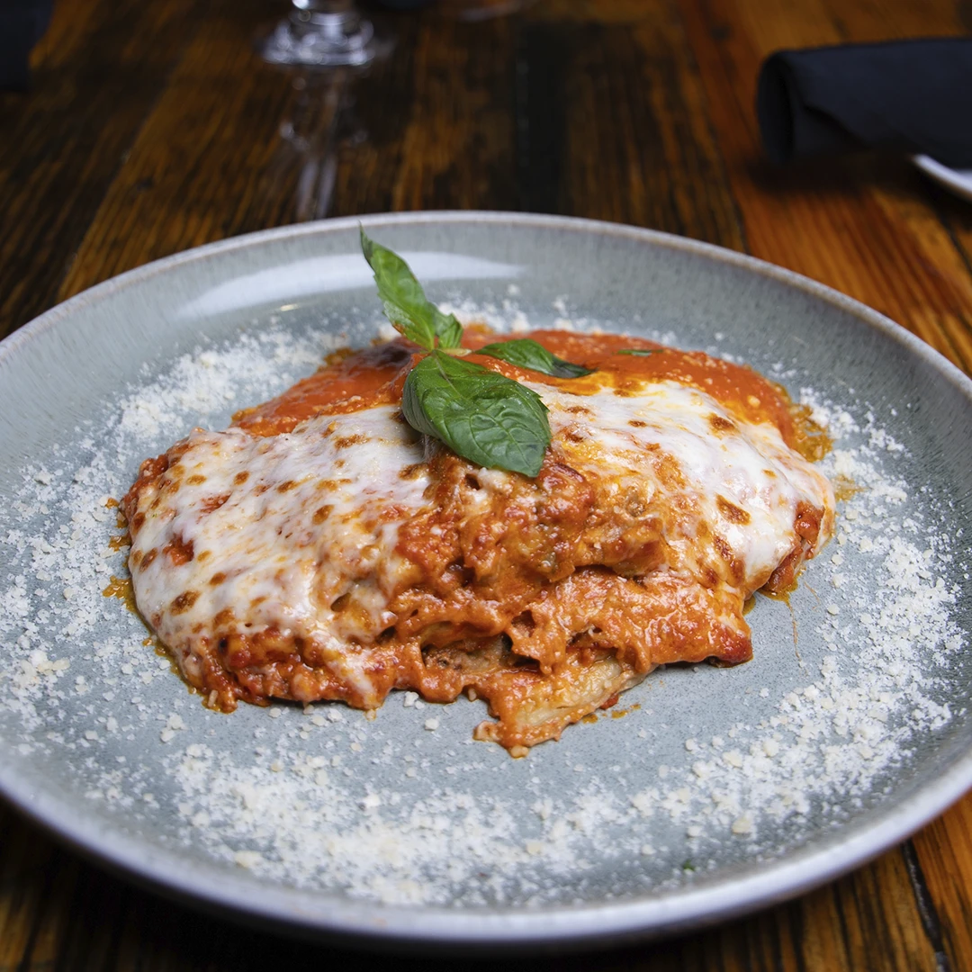Baked Eggplant served with Melted Mozzarella di Bufala Cheese, Homemade San Marzano Sauce & Fresh Basil.
