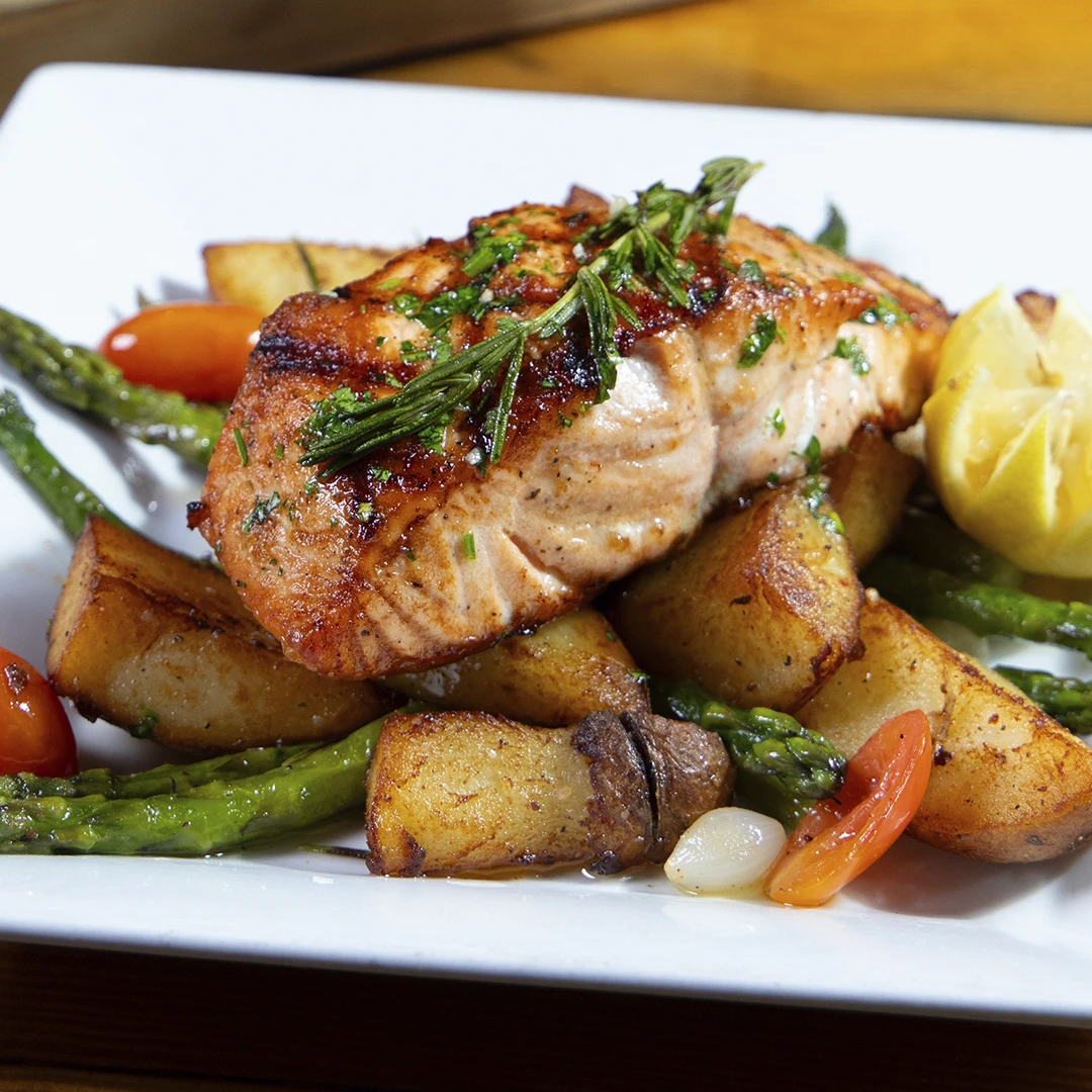 8oz Grilled Salmon topped in a Light Italian Herbs Sauce served with Rosemary Roasted Potatoes & Sautéed Asparagus.